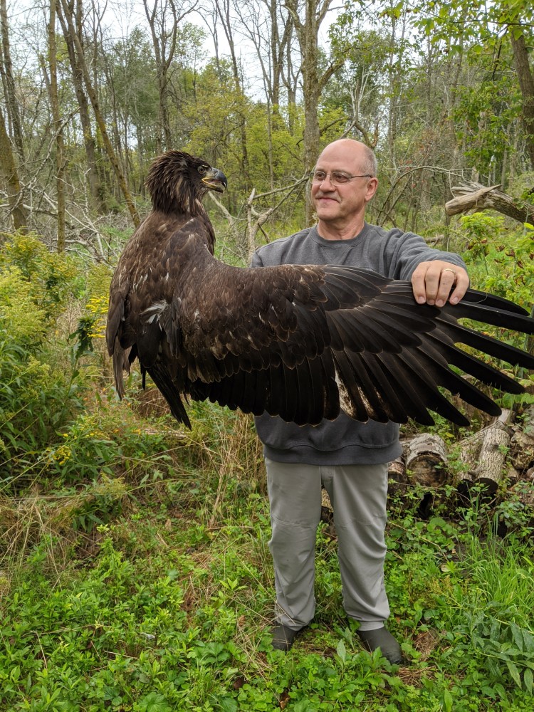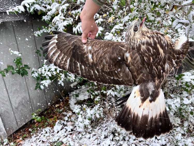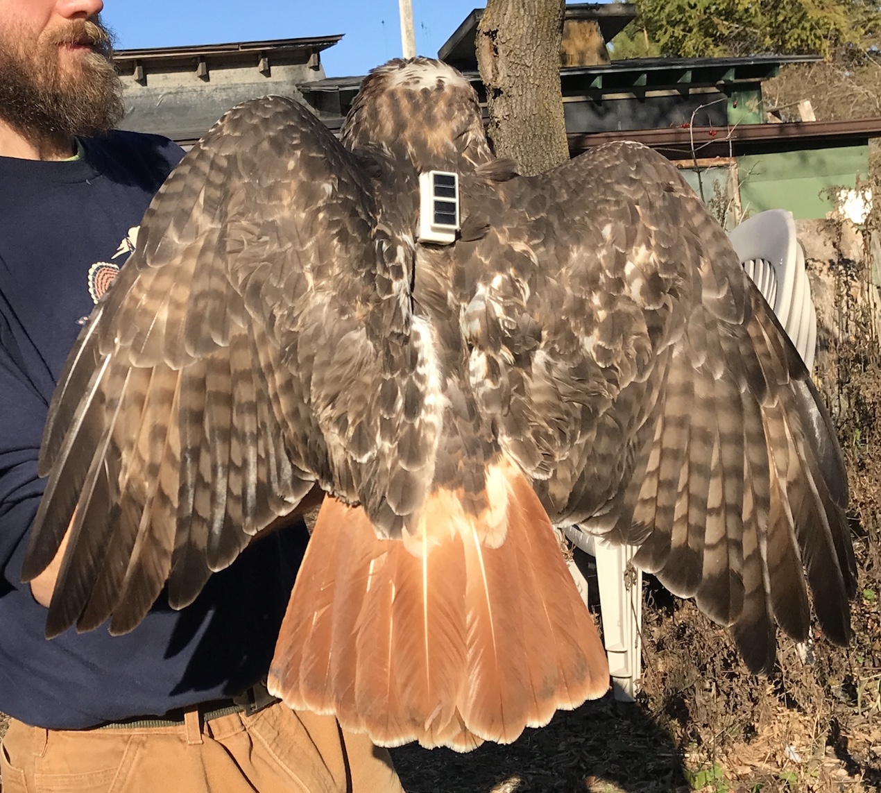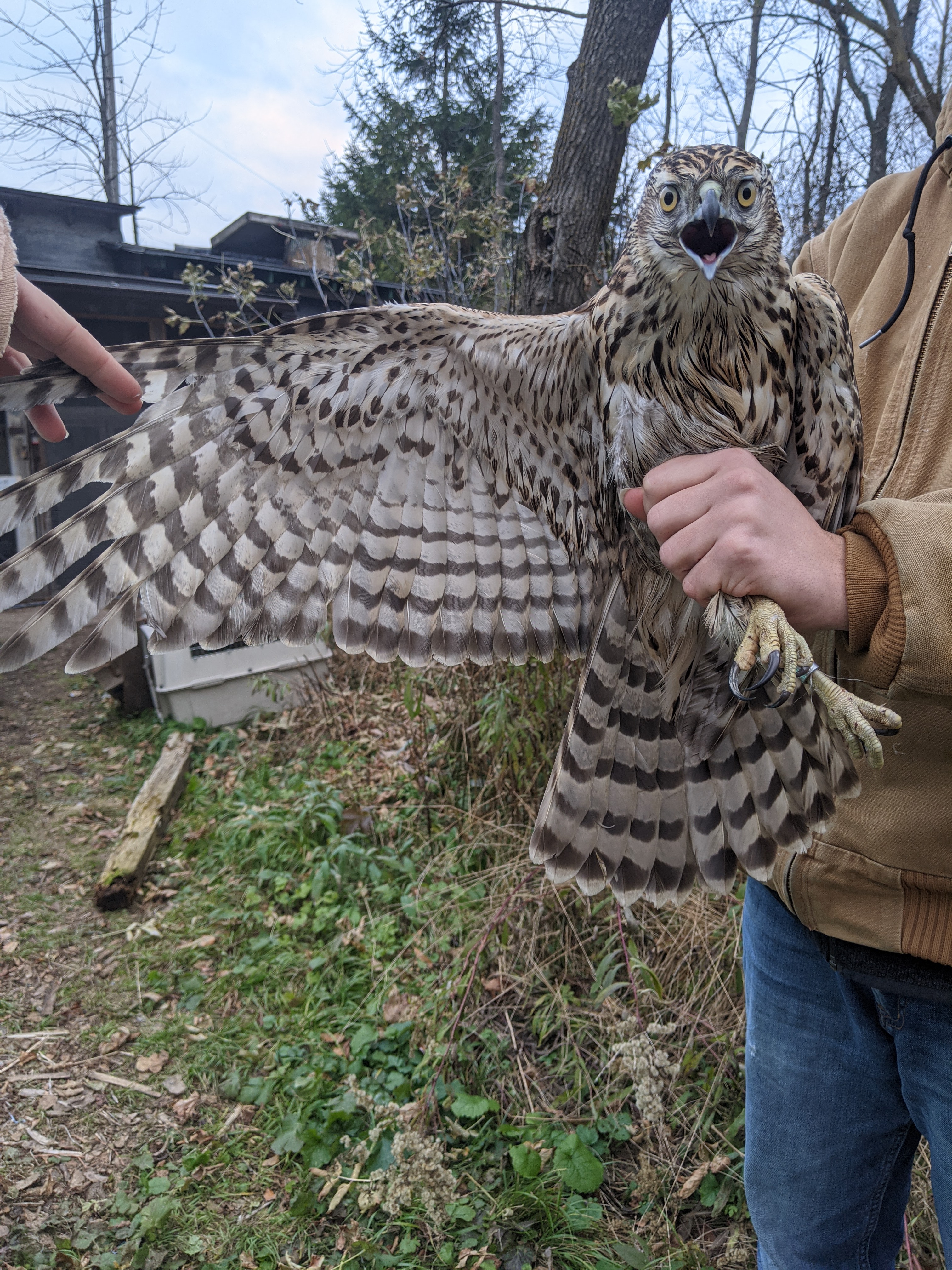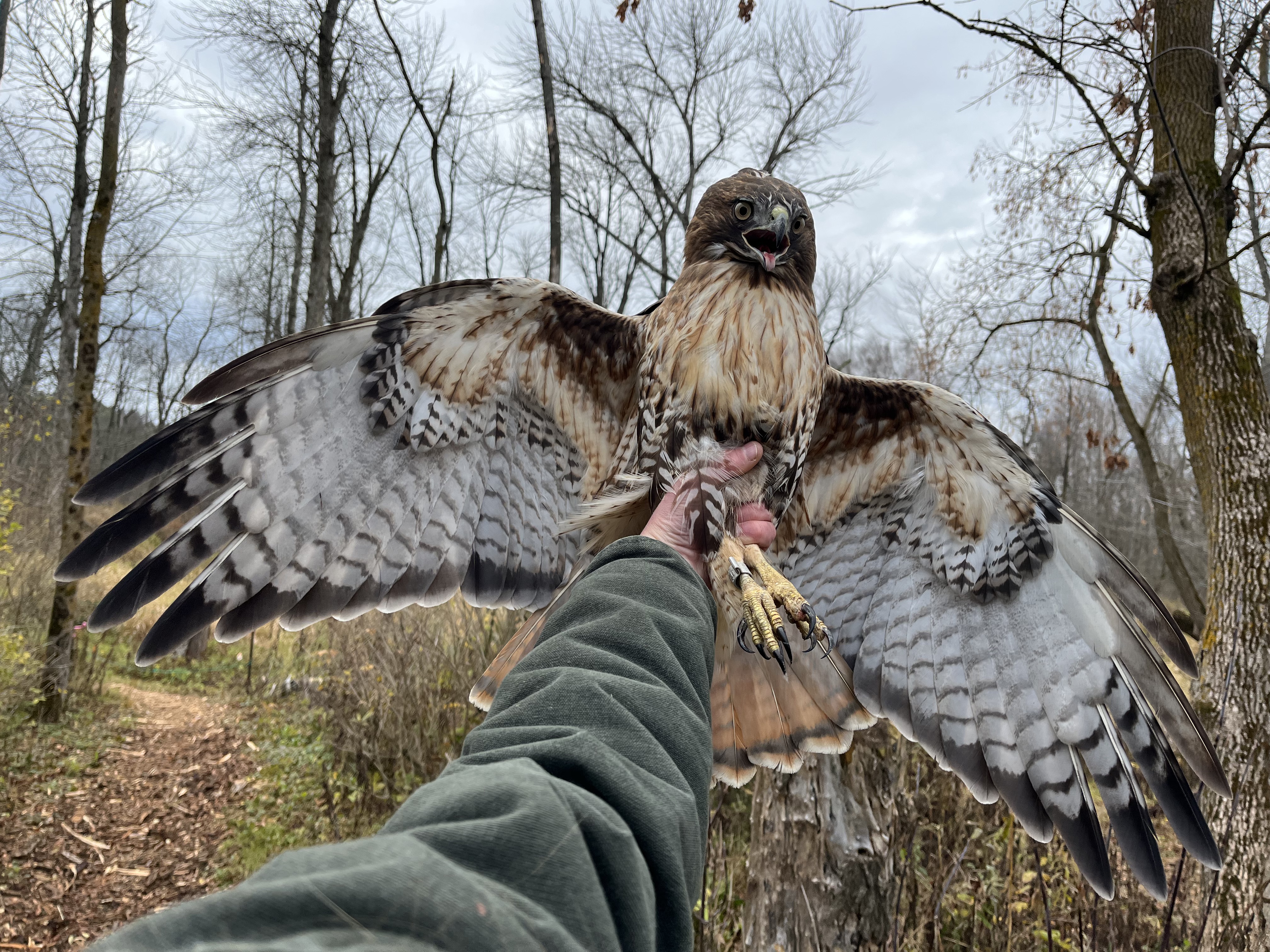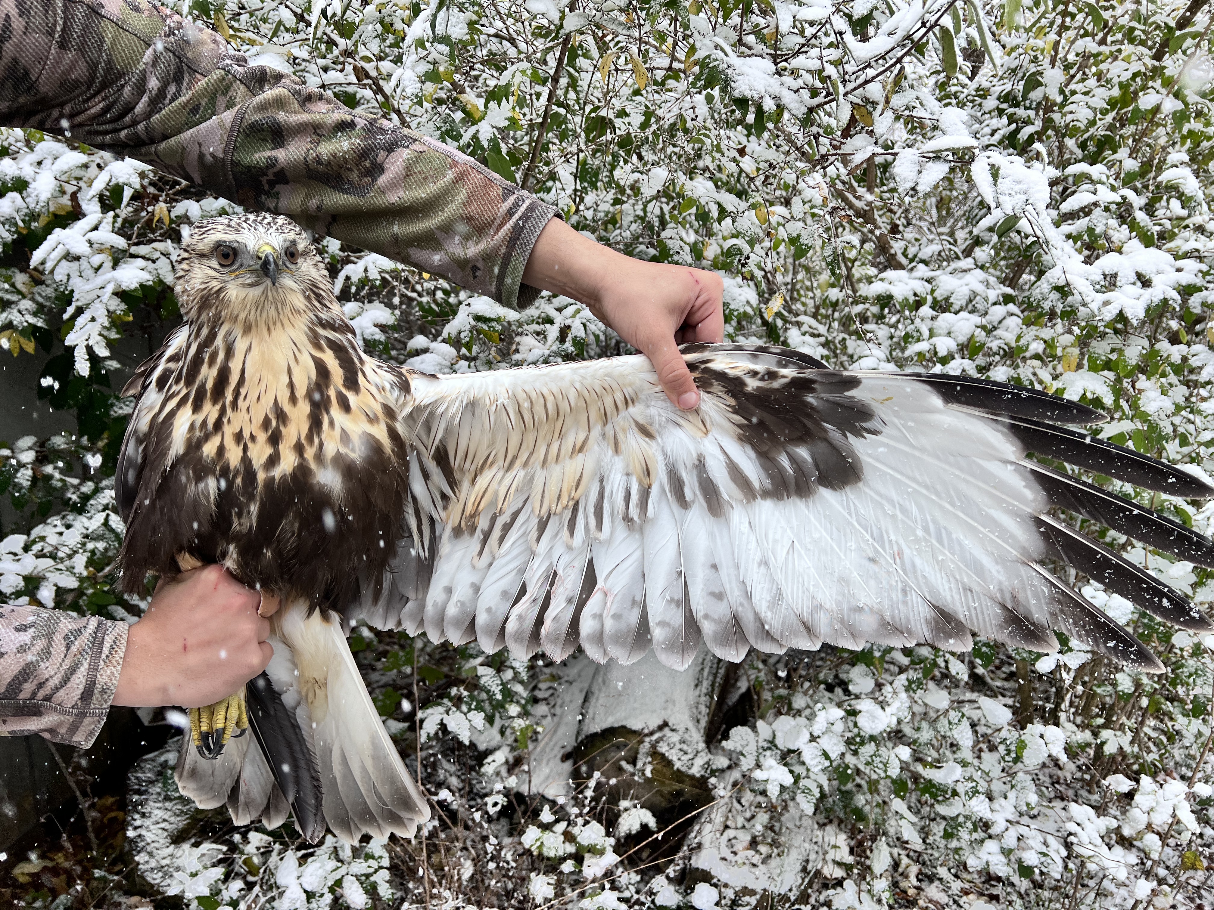 Phoebe and Sarah applying a radio transmitter to a sharp-shinned Hawk – 2022Transmitter on Red-tailed Hawk – 2020sRed-tailed Hawk Project (Lila) – 2020sRed-tailed Hawk Project (Lila) – 2020sWatching the skies – 2023Tom with Bald Eagle 2020Snow on trapping area – 10/31/2023Rough-legged Hawk – 10/31/2023Rough-legged Hawk – 10/31/2023Black-billed Cuckoo – 2023