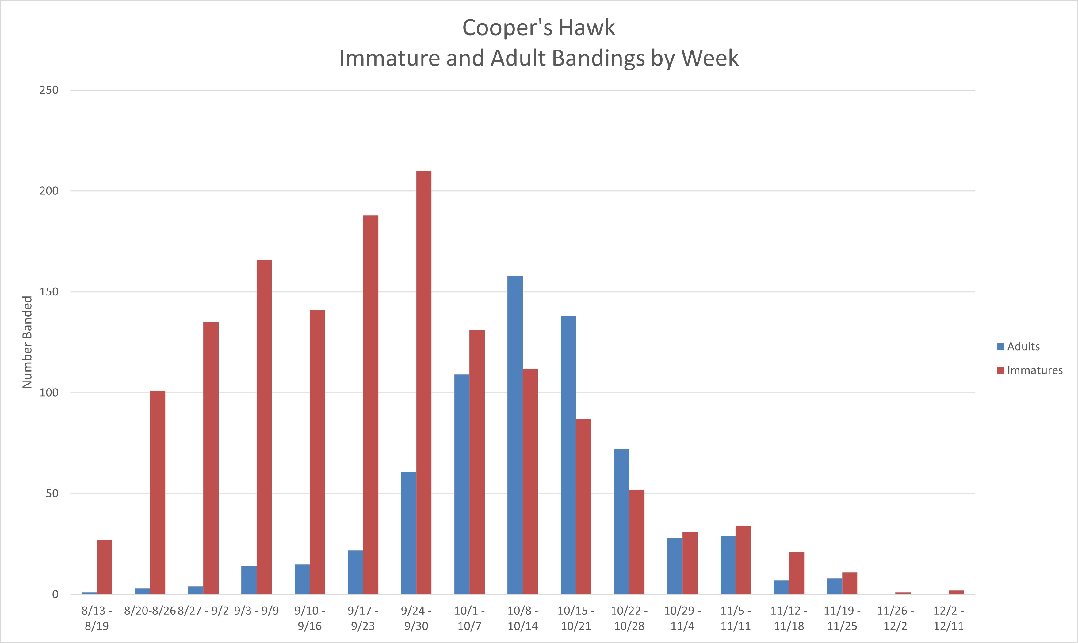 CGORS has trapped and processed 2,167 Cooper’s Hawks since 1952. The breakdown for birds with a recorded age/sex are as follows: