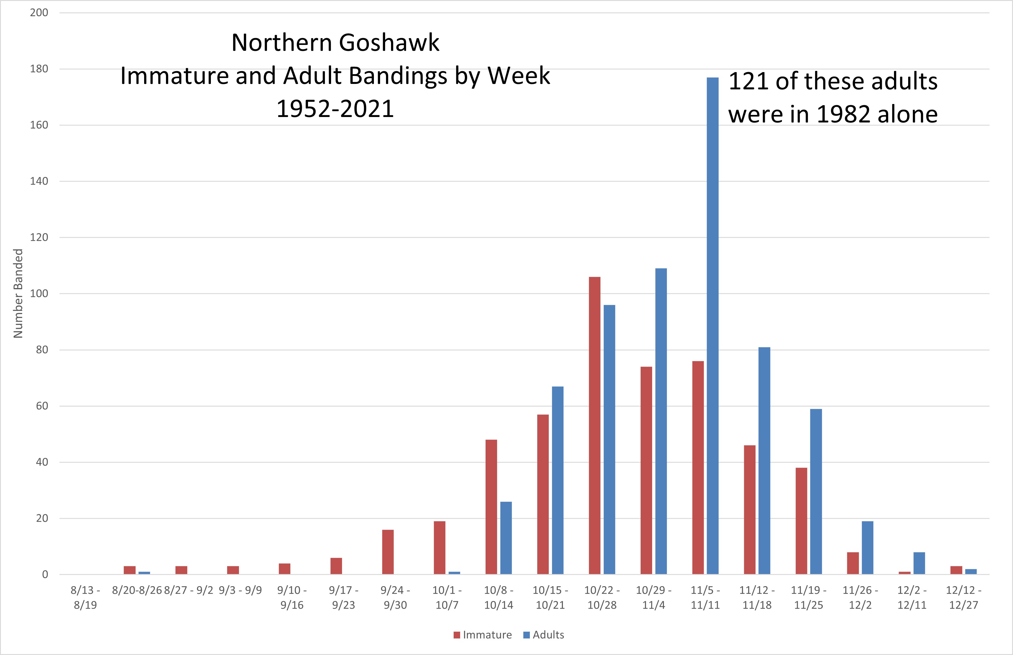 CGORS has trapped and processed 1,198 Northern Goshawks since 1952. Our last great year was 1982 when the station trapped and processed 387 birds. Since that time were are lucky to catch more than one goshawk per year. The breakdown for birds with a recorded age/sex are as follows: