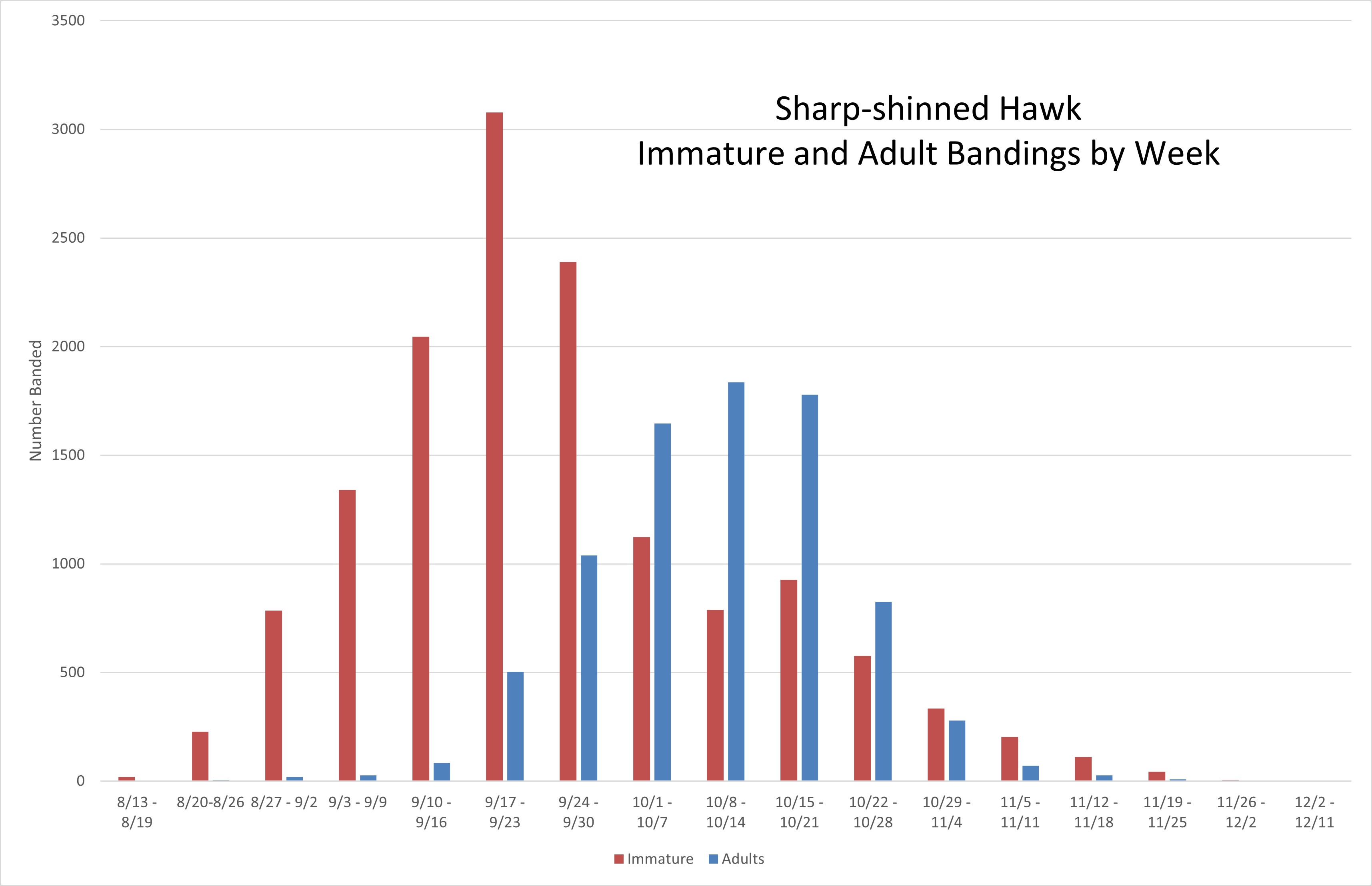 CGORS has trapped and processed 22,503 Sharp-shinned Hawks since 1952. The breakdown for birds with a recorded age/sex are as follows: