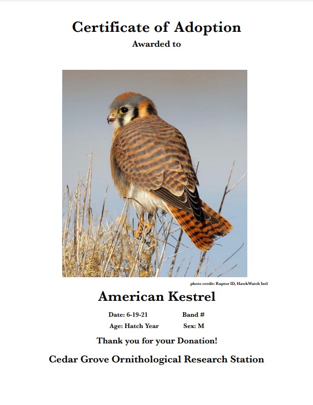 Make a difference and support our research by adopting a raptor in your name. Reserve a special migrating raptor through CGORS and receive naming rights, adoption certificate and a picture of your raptor. If we or any other banding station retraps your raptor, we will notify you of when and where it was last seen.