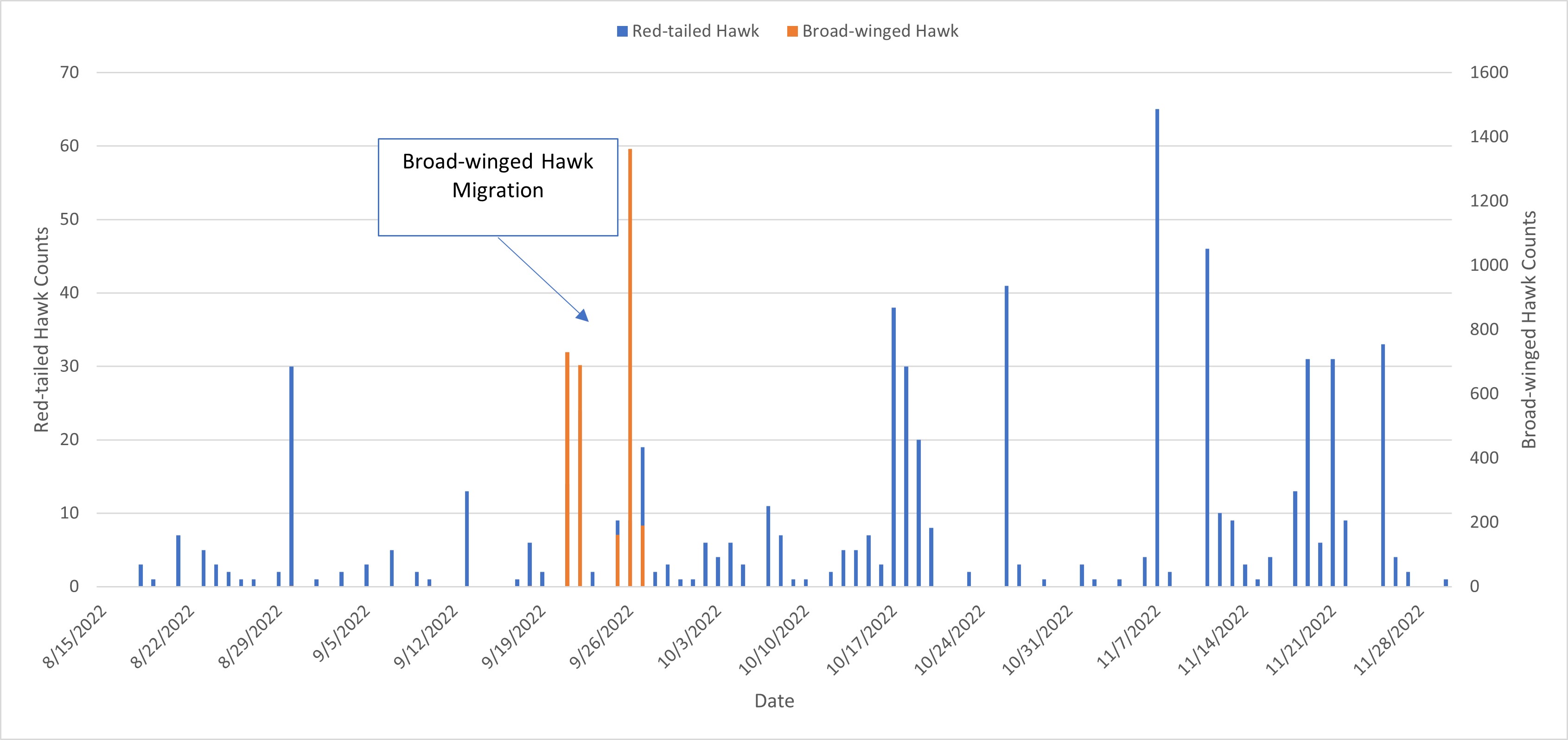 At the station we rarely catch Broad-winged Hawks, however, we are usually witness to an impressive migration. See the graph below. While Red-tailed Hawks migrate throughout the fall, Broad-winged Hawks migrate in large groups called kettles, and are seen during a very short window near the end of September.
