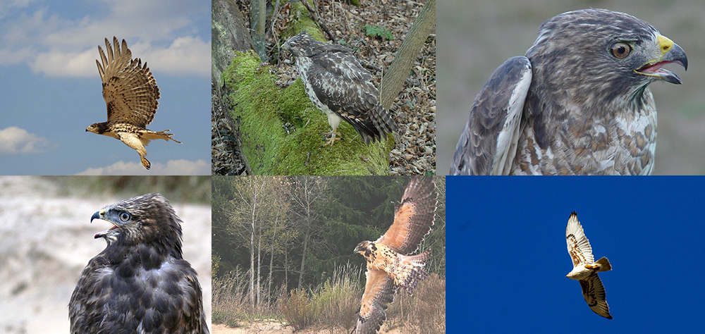 Buteos: Wings are long and broad with relatively short tails. Known as “soaring hawks”, they are commonly seen soaring overhead in open areas. Often seen perched in conspicuous places such as roadsides and utility poles. In fall migration, these birds can be seen soaring southward using warm air currents.